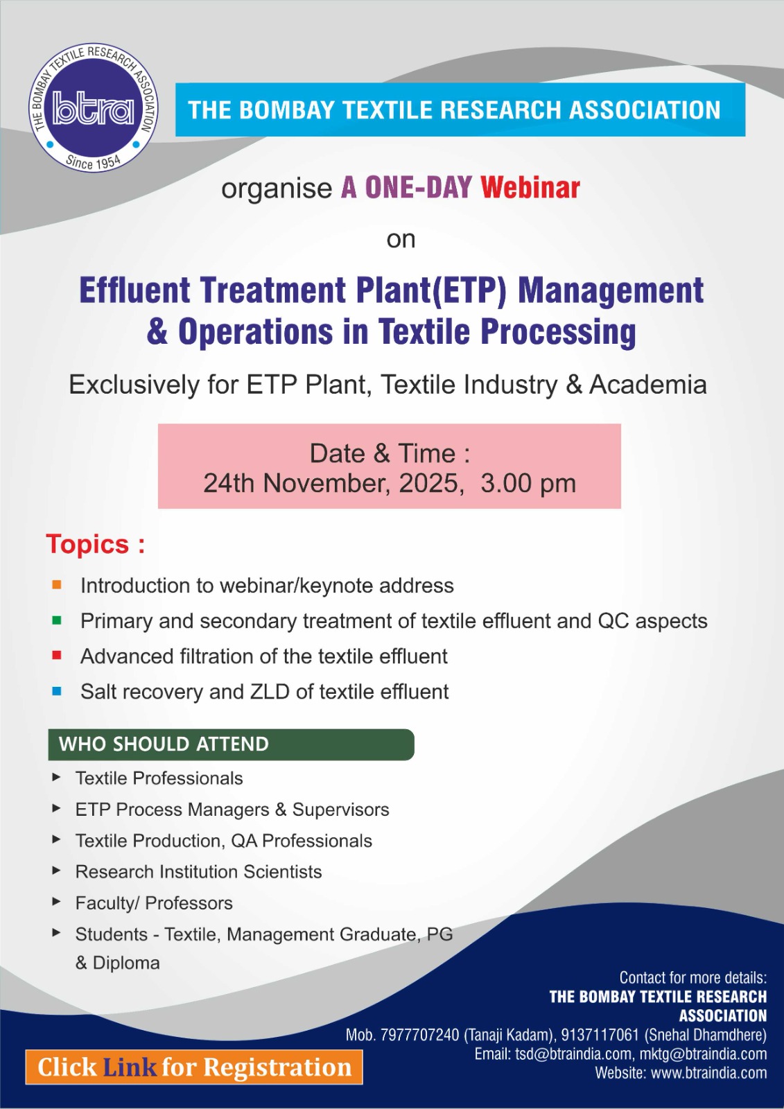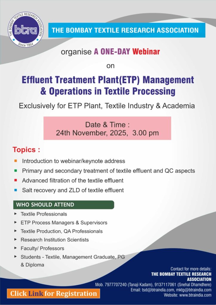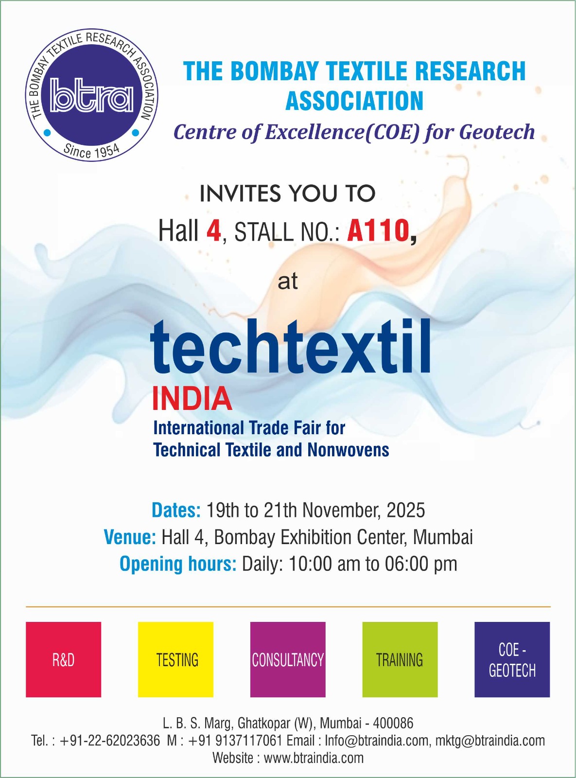 techtextil India (International Trade Fair for Technical Textile and Nonwovwns) Dates: 19th to 21st November, 2025 Venue: Hall 4, Bombay Exhibition Center, Mumbai Opening hours: Daily: 10.00am to 06:00pm